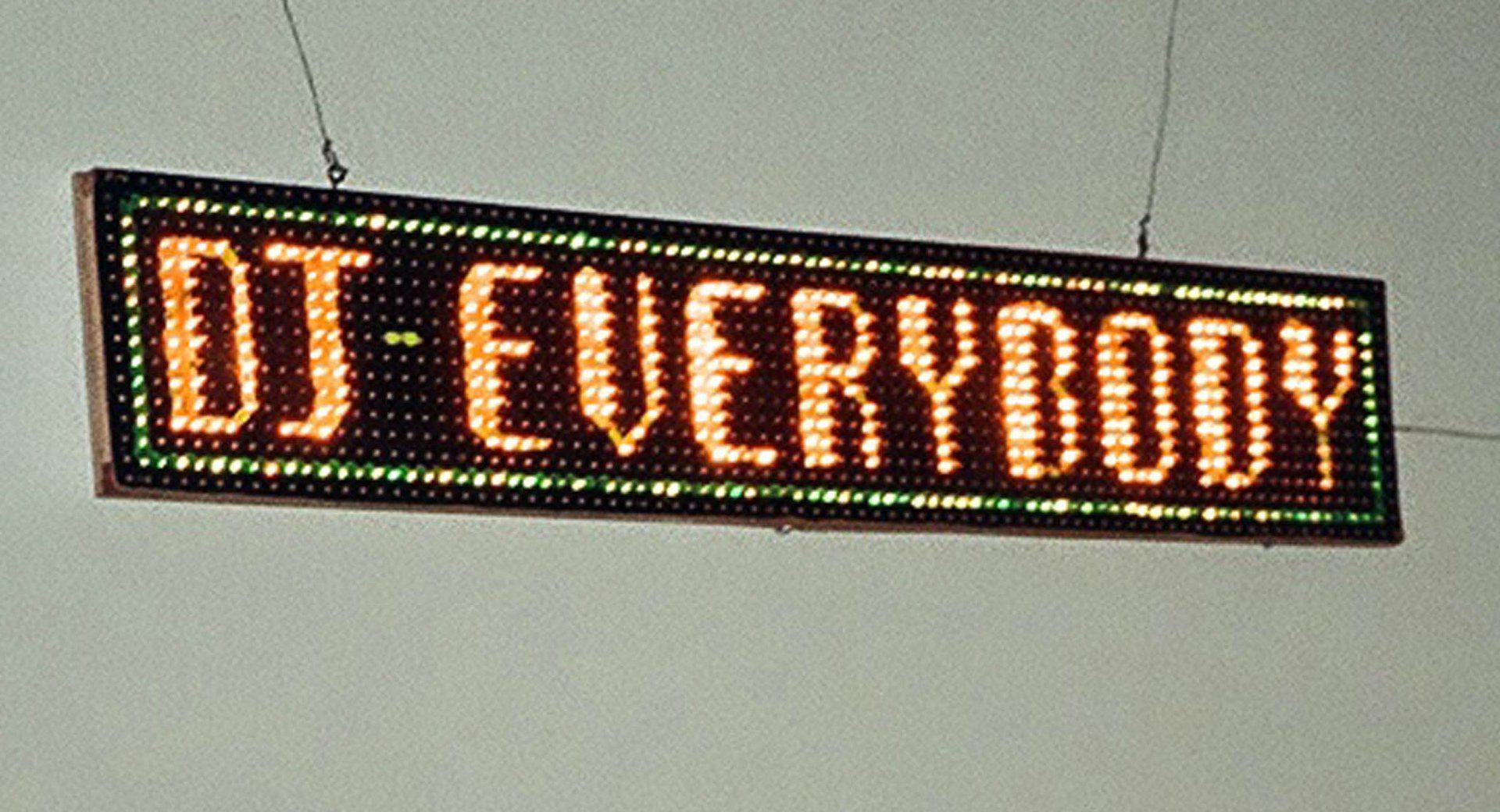 DJ Everybody is a hybrid between music and art and gives everybody the opportunity to play her or his set; a kaleidoscope of music, styles and statements on the mike. The border between audience and performer is broken down. DJ Everybody is an interactive happening, a dialogical network, that turns every receiver into a sender and vice versa.